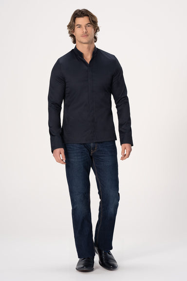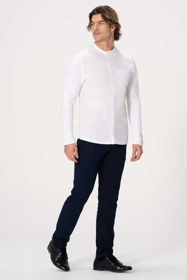 Menās shirt-type chefās jacket. Slim fit. With saddle stitch trim. Button-down shirt collar. Placket with concealed press stud fastening. Princess...