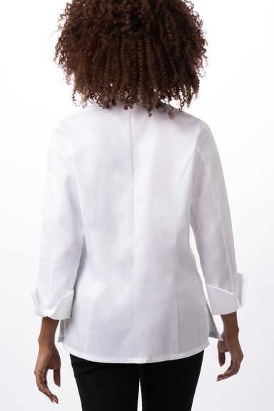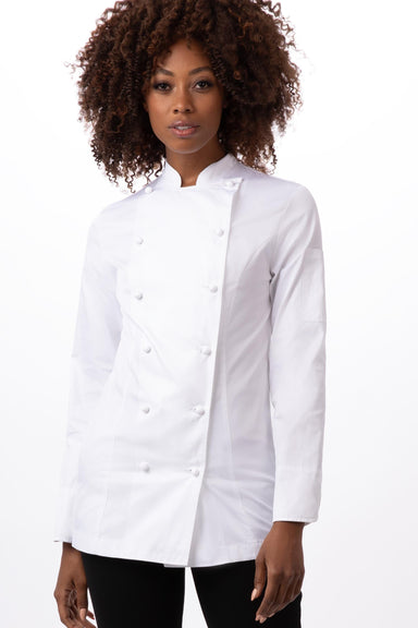 Grand Chef Lady jacket. Hand-rolled crush-resistant buttons. Long sleeves. Embroidered "B" logo on left cuff. Underarm air vents. Back shaping sea...