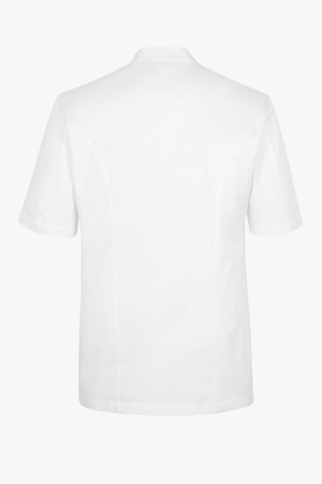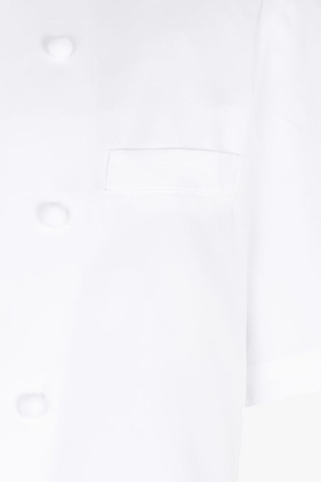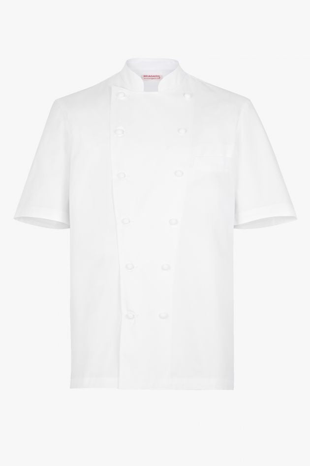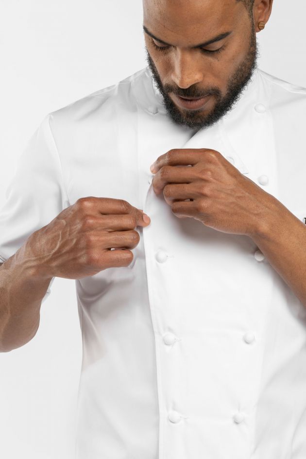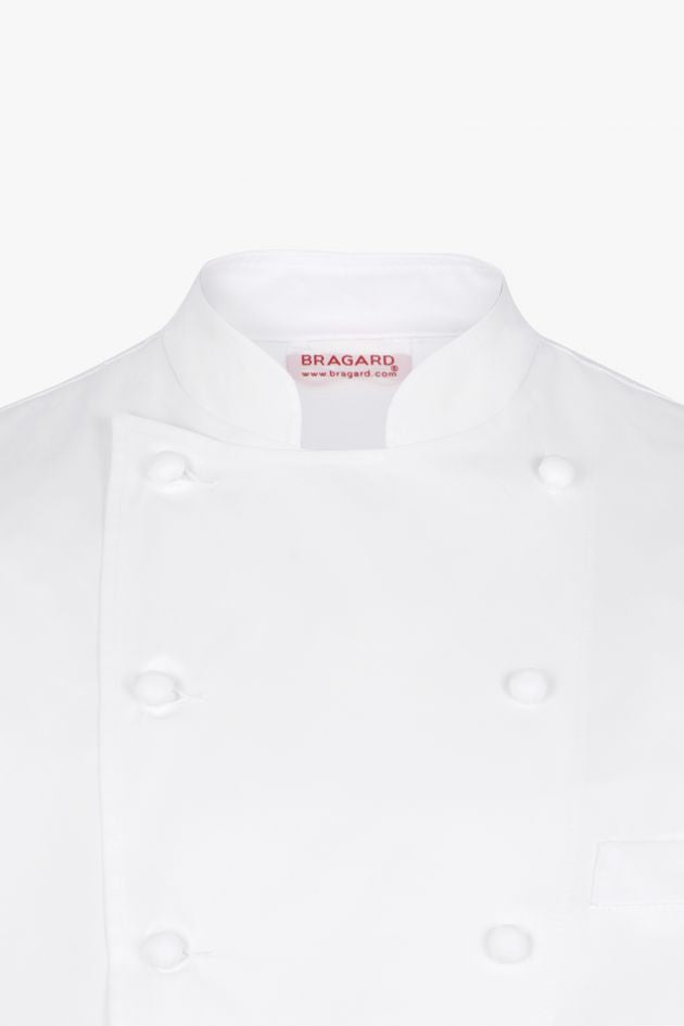 The prestigious Grand Chef® Short Sleeve Coat designed by Maison Bragard with Monsieur Paul Bocuse is the iconic jacket known throughout the world. It offers, beyond its aesthetics, practicality recognized by all, particularly with its handmade fabric buttons. This version of the Grand Chef Short Sleeve coat is without pockets for a streamlined look. It is made from a double-twisted PIMA PREMIUM cotton fabric which gives the jacket exceptional properties. The fibers are fine, soft and extremely strong. Cotton has absolute dimensional stability which makes this model non-shrinkable.